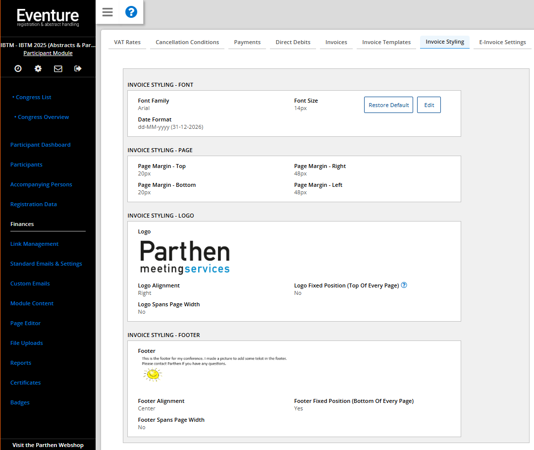 Via finances -> Invoice styling you can set the styling of all participant invoices, credit notes and reminders.