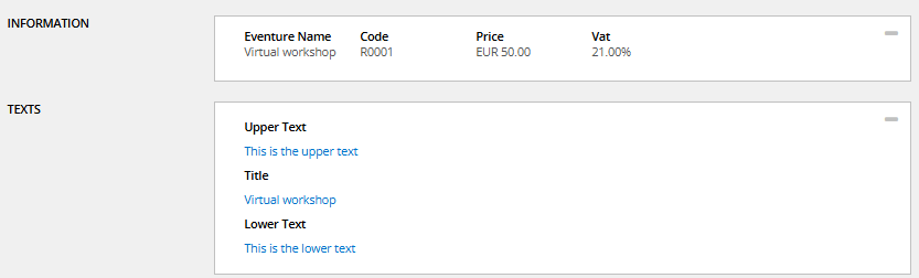 Use 'Preview setup' -> Registration events to see how all events with the upper/lower texts etc. look like on the registration details page.