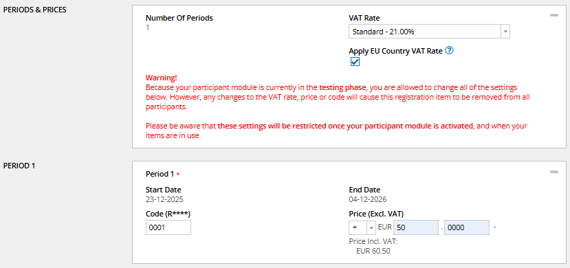 Fill out all details, code (R****), price (excl vat). The start date and end date of the registration events are filled in automatically.
