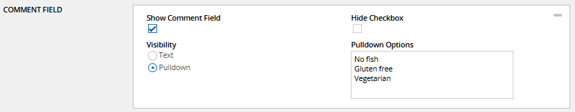 When you switch on the comment field, you can have a participant fill out a comment at a registration event. For example if you ask if a participant has dietary request, he/she can fill out what request.