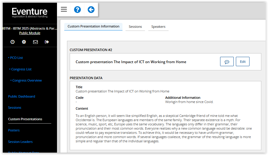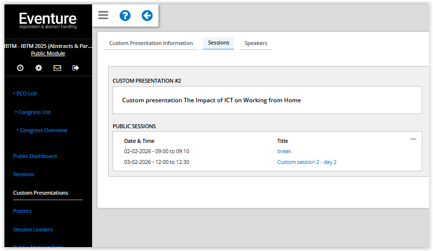 Via the menu 'Custom Presentations' all custom presentations are displayed that are assigned to session time slots within this public module.