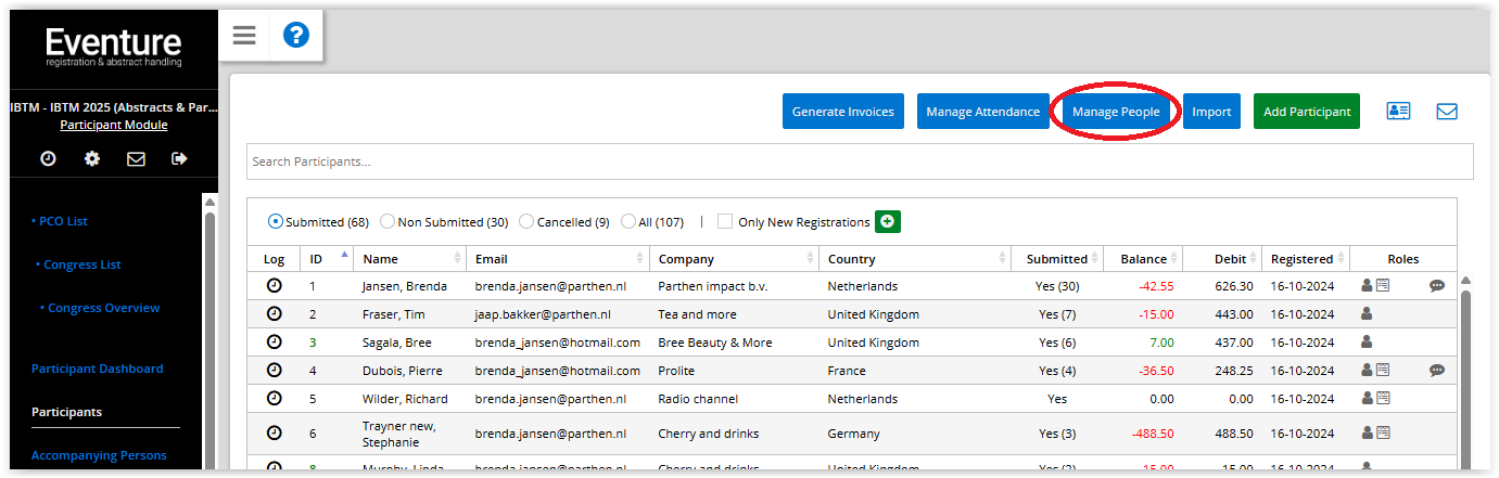 Here you can manage the attendance of your participants by marking them as 'Started Attending' and 'Stopped Attending', which also allows you to easily see who is currently 'present', who has not attended, and who has attended the congress.