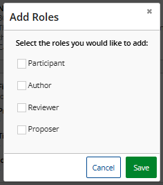 | Select all the checkboxes of the roles you want to add to this session leader. After you have for example added the 'Author' role, you can connect this session leader/author to an abstract via the abstract module. |