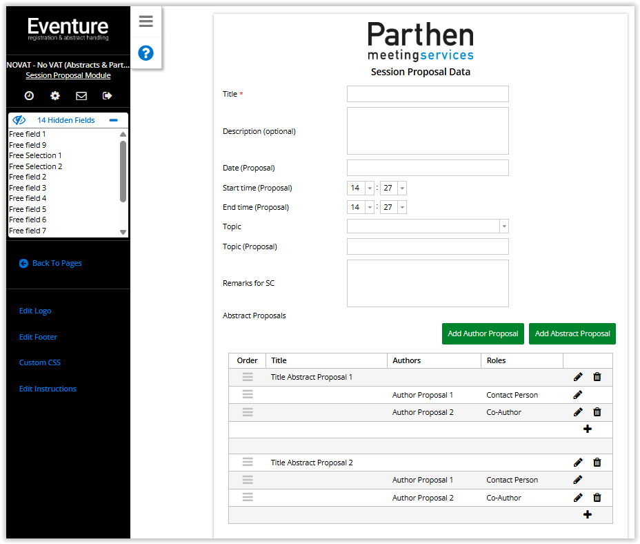 Depending on your settings in the 'Session proposal module' settings, the abstract proposals, session leader proposals and custom presentation proposals are visible. And of course if the proposer choose for a closed or open session proposal.