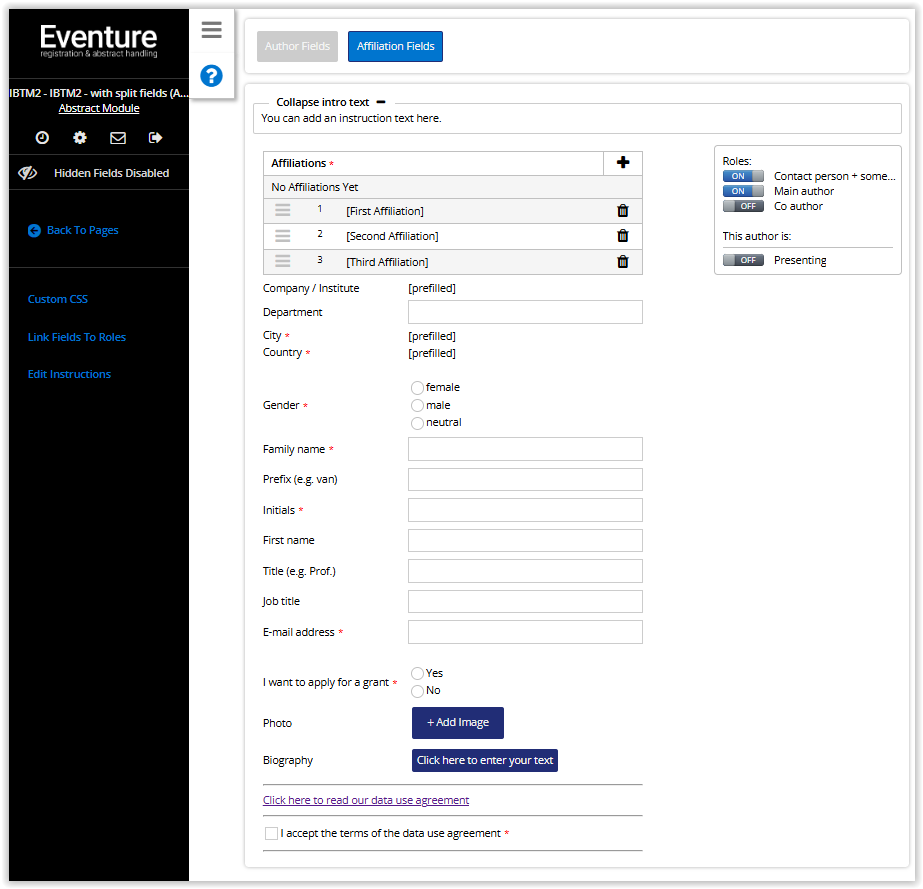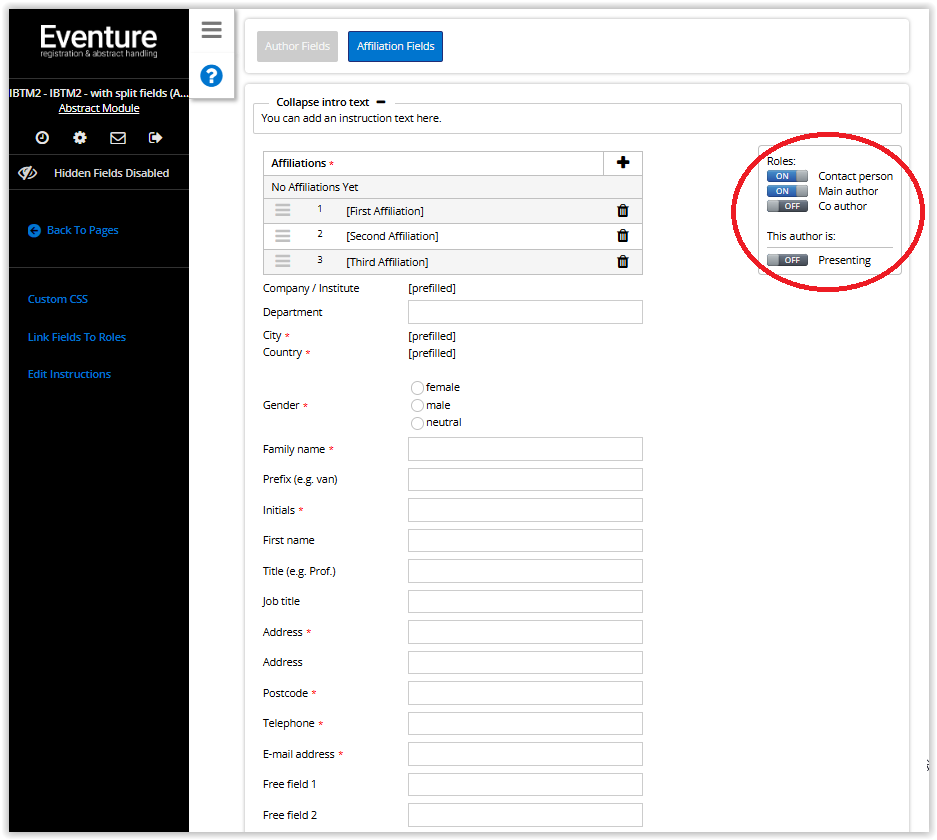 Per role (contact person/main author/co-author) you can set the fields that need to be entered.