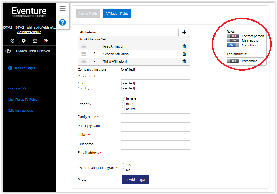 Per role, contact person, main author and co-author you can check the boxes for the fields they need to fill out.