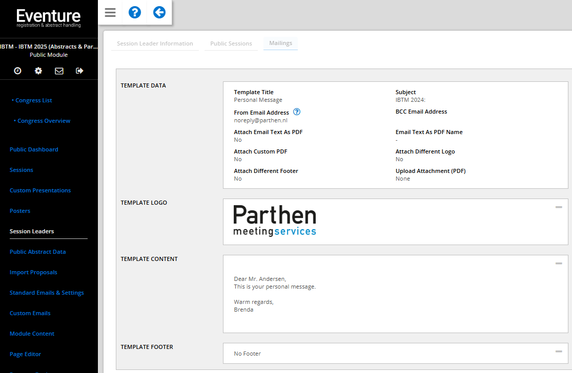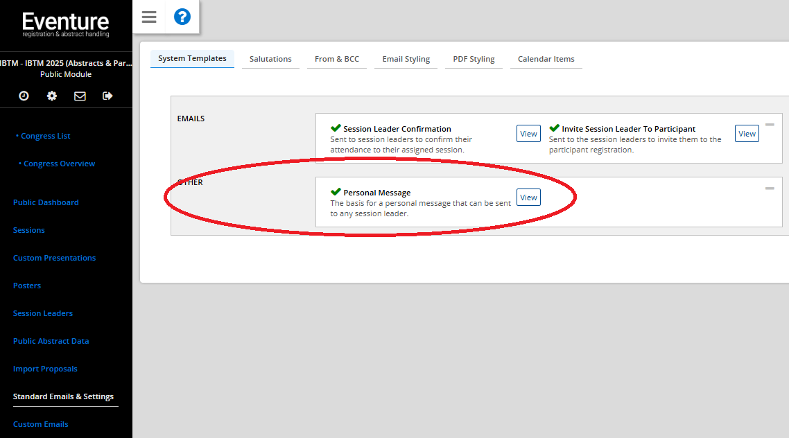 A 'Personal Message' email template is available, allowing you to set up the basis for a simple email message that you can send to your registered session leaders.