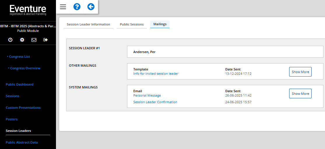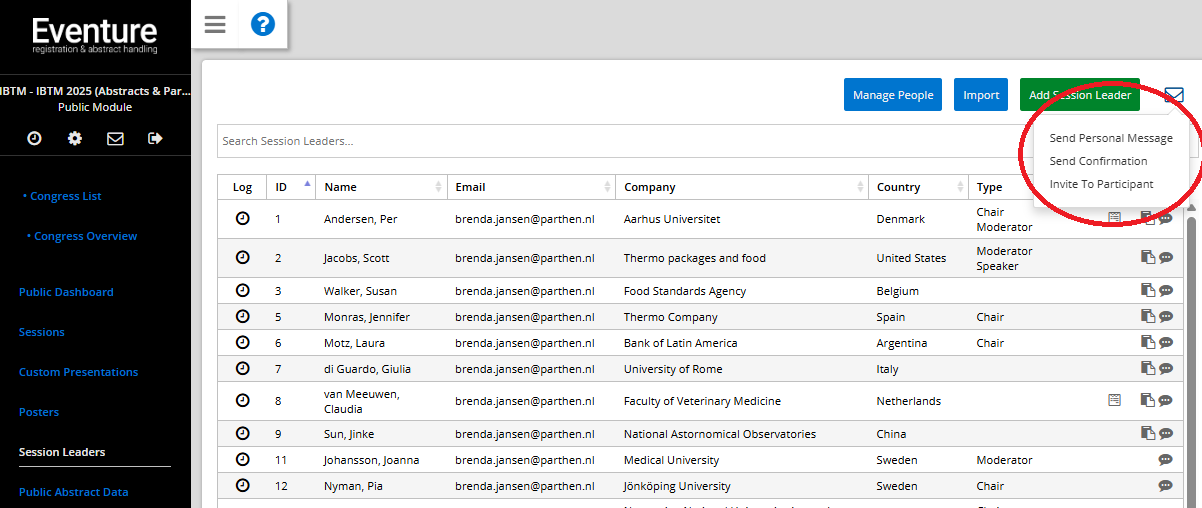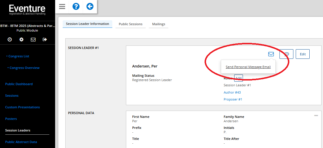 Once you have set up this template, simply open one of your registered session leaders, click the envelope icon and choose 'Send Personal Message Email' option.