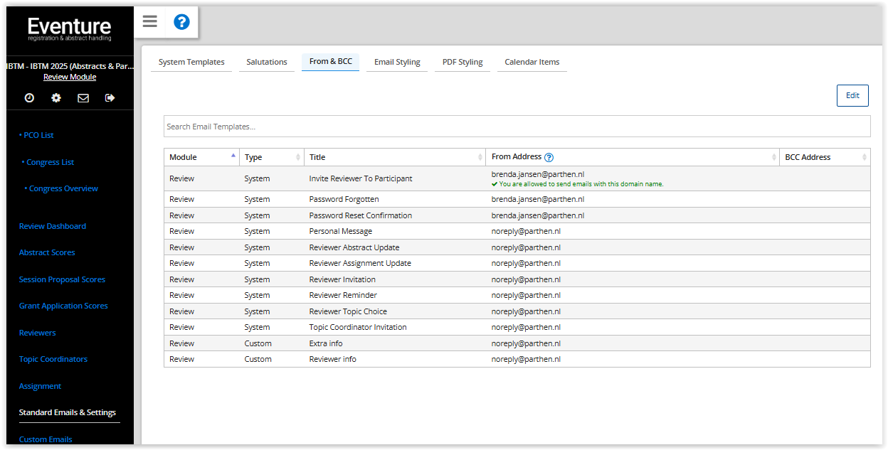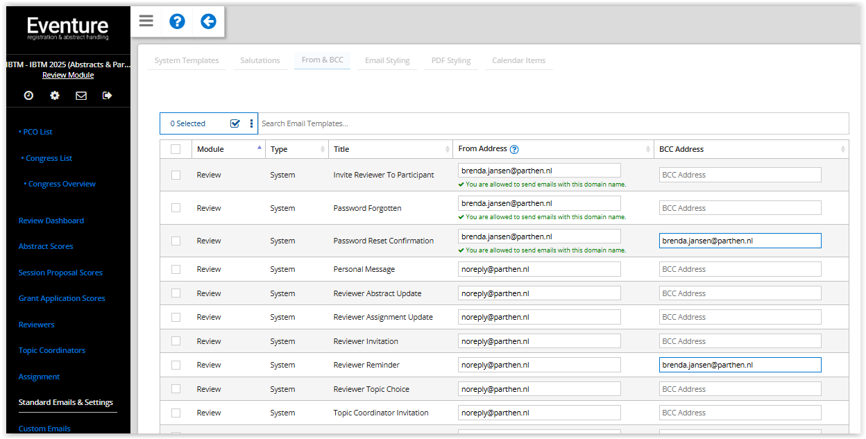 On the 'From & BCC' tab you can check and change all From and BCC email addresses you use for this congress and module.