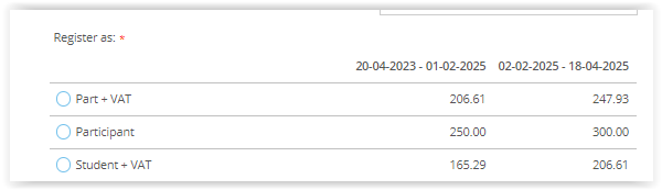 In the above example we filled in at period 1: Early bird fee until Feb 1, 2025 and at