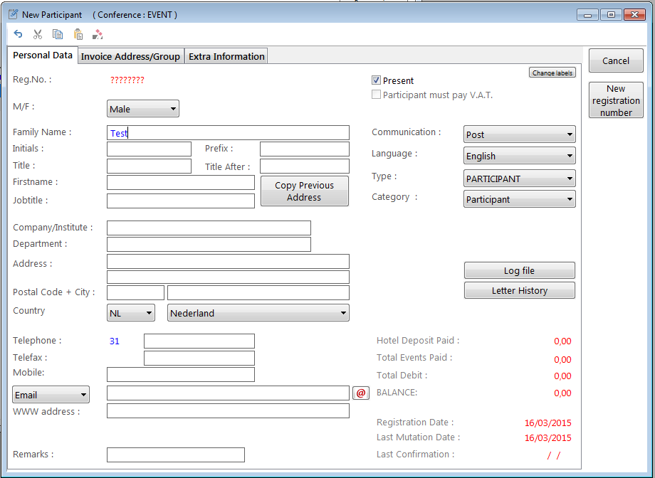 If you have setup your congress, you can start adding the participants for this congress. Go to the Participant Module and click on the 'Registrations' button. Use the 'New' button to create a participant. The following screen will appear.