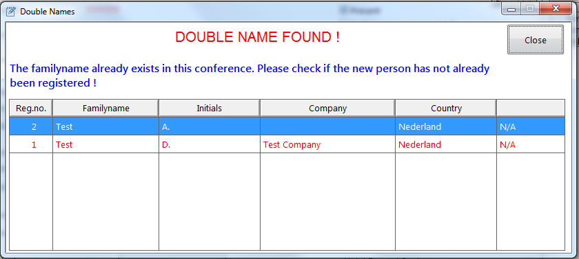 You can now check whether the participant you entered is already registered. If this is the case, select ‘Close’ and ‘Cancel’ in the ‘View/Edit/New Participants Data’ screen. If this is not the case, select only ‘Close’ and continue with entering the participant’s details.