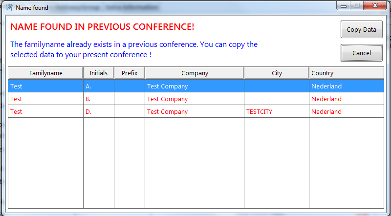 The system gives the existing names in the coupled congress which are identical to the name you entered. If the person already in the system is the same person, then you can copy all of their details to this congress with one click on the ‘Copy Data’ button. If there are small differences, then you can copy the details given and only need to change those that are different. Only the details for the ‘Personal Data’ screen are copied.