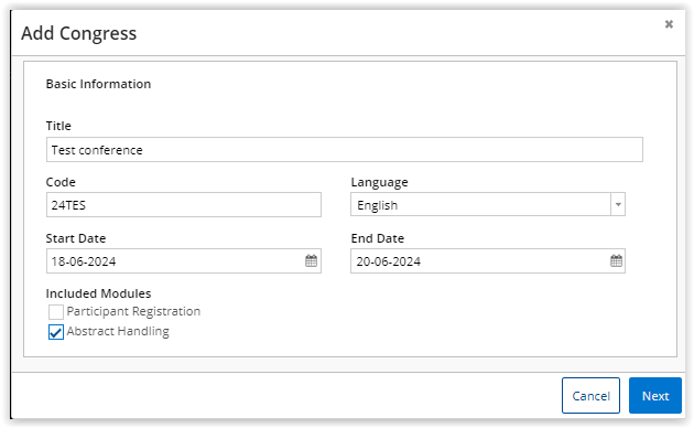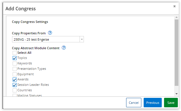 After you filled in the first page with data, you click on 'Next'. On the third screen you can select from which conference you want to copy the data. Please note that you can only make a copy of a conference with the same language.