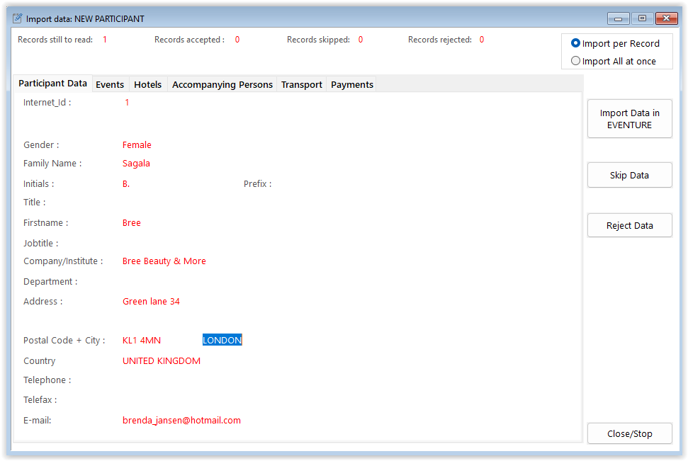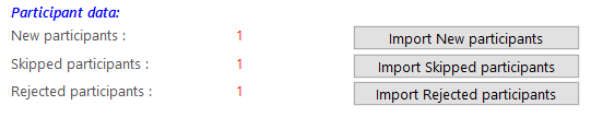 By clicking on the ‘Import New participants’, ‘Import Skipped participants’ and ‘Import Rejected participants’ buttons you can view the registration data and decide whether to accept the data, reject it or skip it temporarily (Skip).