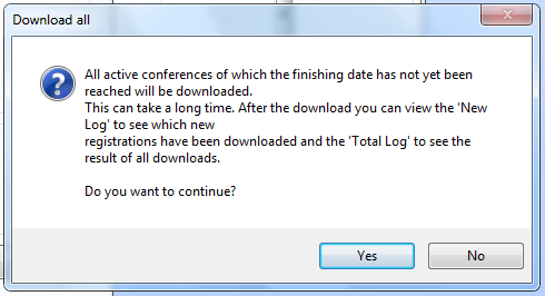 The button ‘Download registrations for all Conferences’ gives you the possibility to download all active conferences all at once. Only the download will be done, checking and importing the participants will not be done automatically. You can use the ‘Download registrations for all Conferences’ button once per 2 hours.