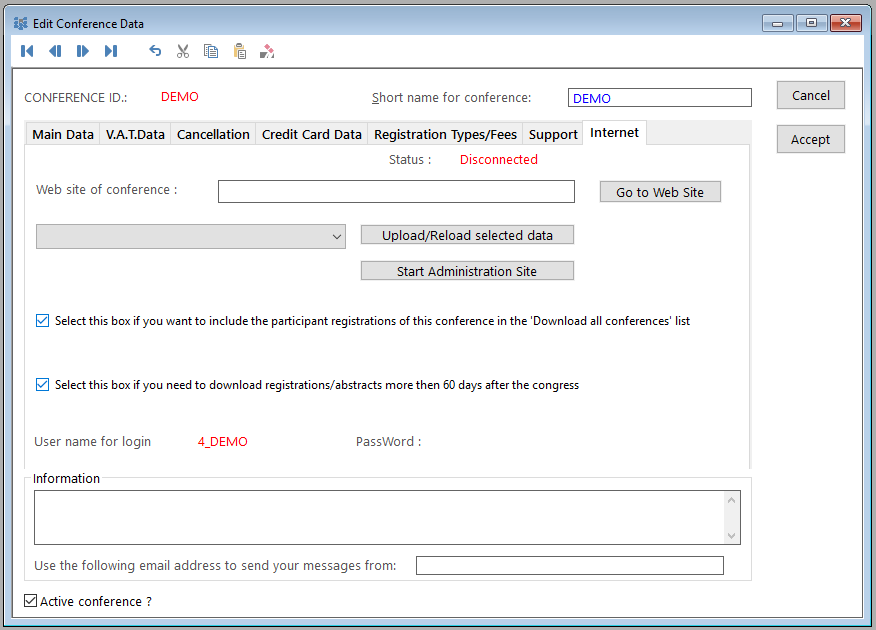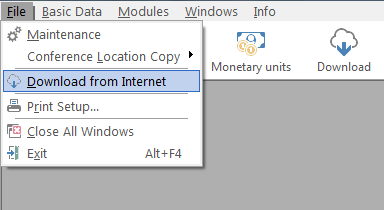 Congresses older than 60 days after the end of the congress are not shown in this list. You can change this in the internet tab of the ‘Edit Congres Data’ screen. Check the box for 'Select this box if you need to download registrations/abstracts more then 60 days after the congress'
