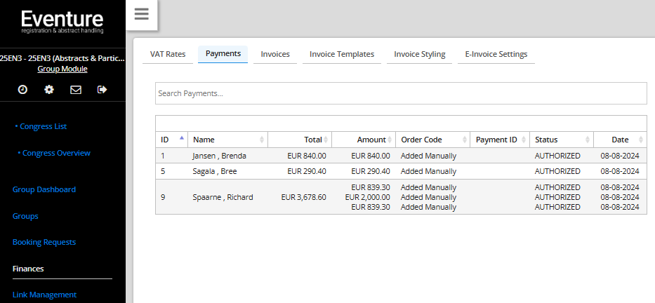The 'Payments' tab displays all of the (attempted) payments that were made by each existing group.