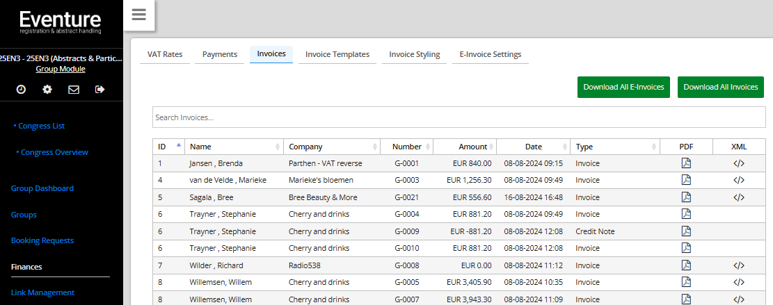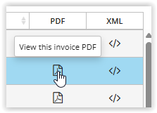 | Use the xml tag icon do download the e-invoice of this group. By using the 'Download all e-invoices' button, you can download all e-invoices in a zip file. |