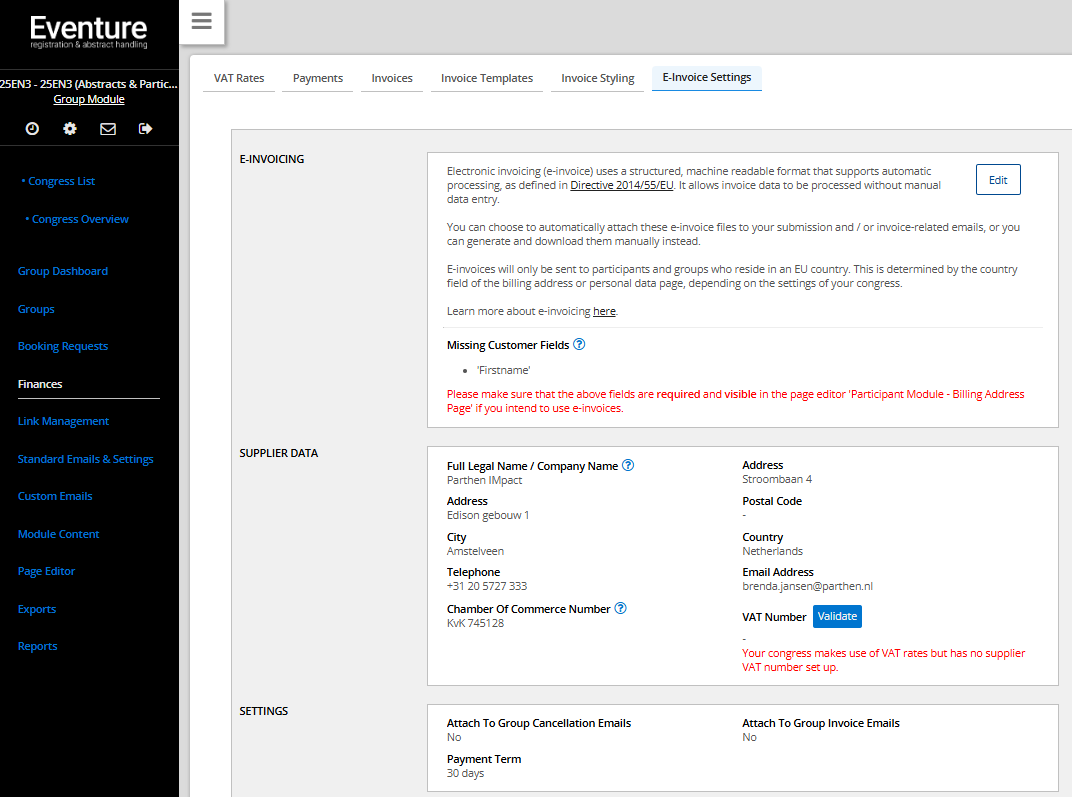 On the last tab E-invoice settings, you can configure the basic information for your e-invoices. Make sure your supplier data is filled in and all the required fields are visible and set to required in the group pages.