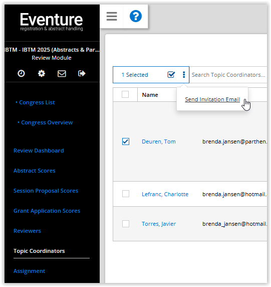 Once your accounts are ready and you have set up the email, select the coordinators in the list, then click the three dots and choose 'Send Invitation Email' to send out the account information email.