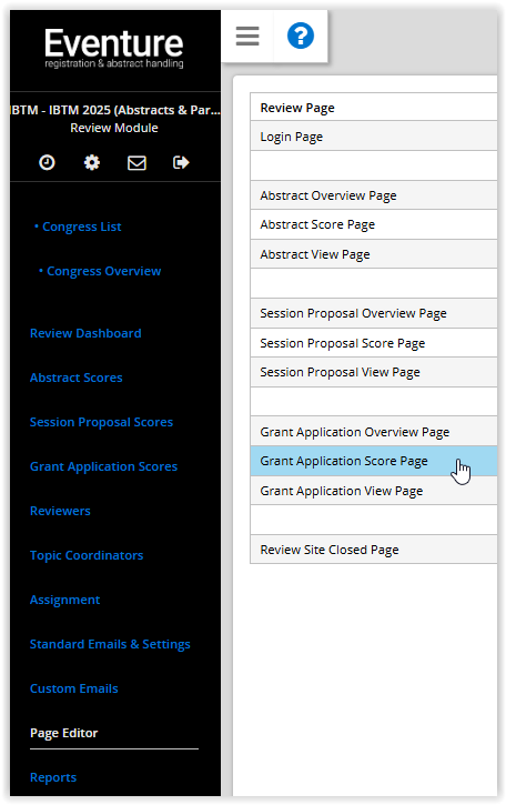 In the Review module, the Grant application scrore page can be found via the 'Page editor'. The page provides you with five numeric score fields, five listing score fields and two text areas.