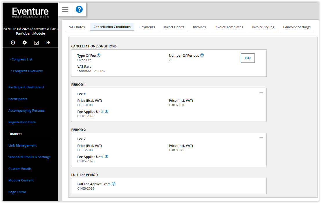 The Cancellation conditions tab allows you to set up your cancellation periods and cancellation fee amounts. Click here for more info.