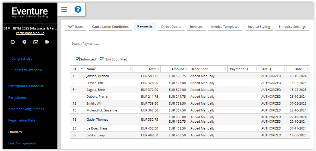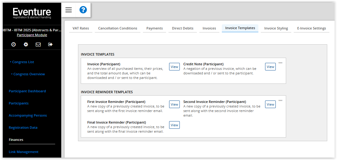 | On the Invoices tab you can view all of the invoices and credit notes, that were created for your participants. Simply click on the PDF icon to view an invoice. With the green 'Download all' button you can download a zip file containing all participant invoices. |