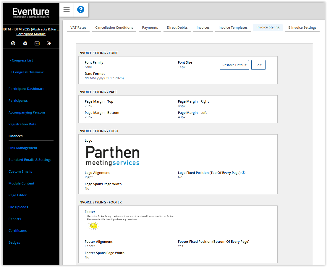 On the Invoice styling tab you can set up the styling of your invoices, like the font, size, logo etc.