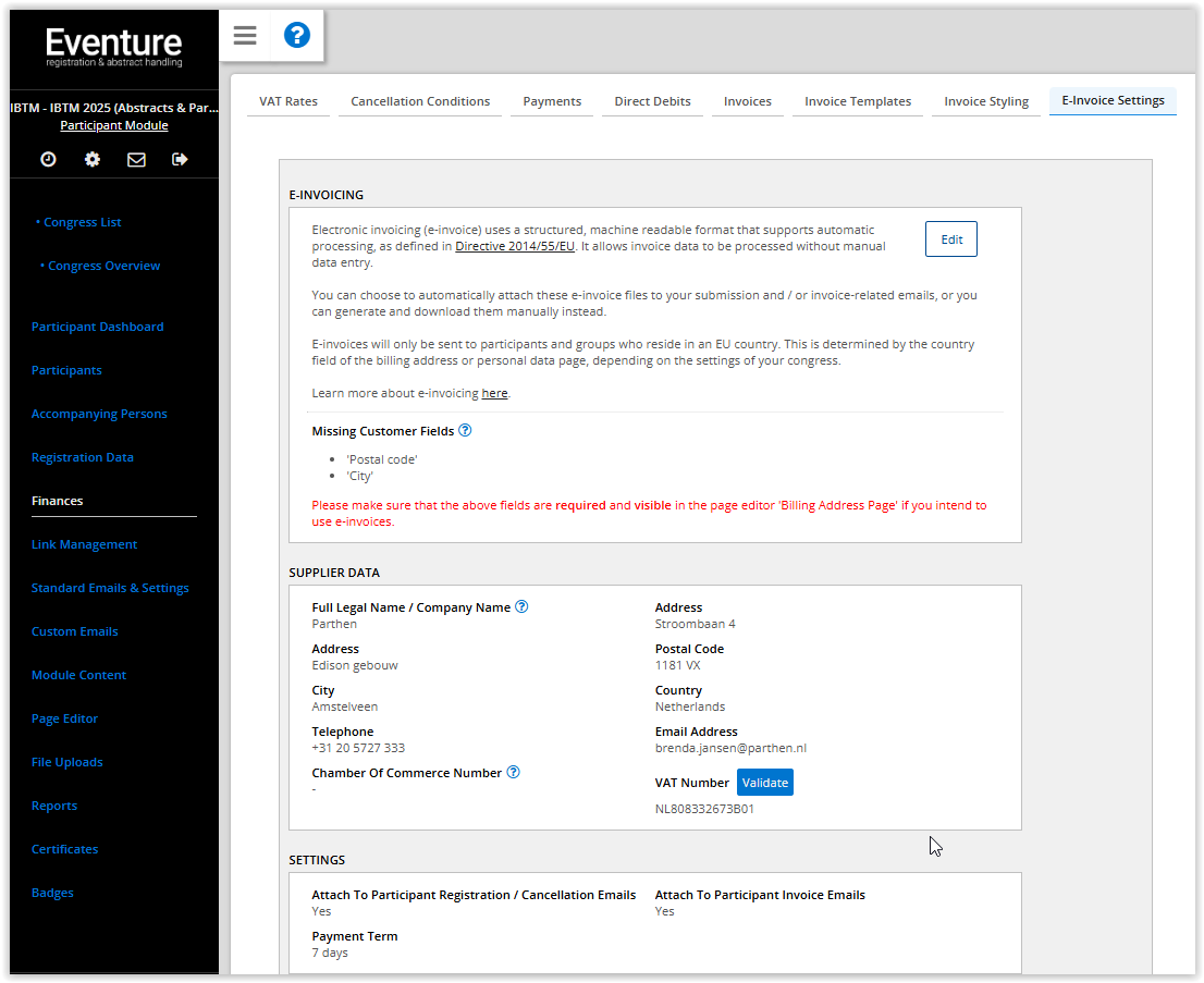 On the last tab E-invoice settings, you can configure the basic information for your e-invoices. Make sure your supplier data is filled in and all the required fields are visible and set to required in the participant pages.