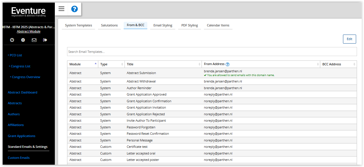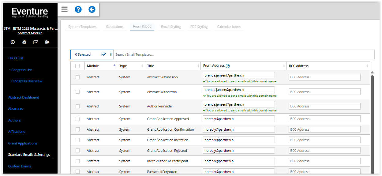 On the 'From & BCC' tab you can check and change all From and BCC email addresses you use for this congress and module.