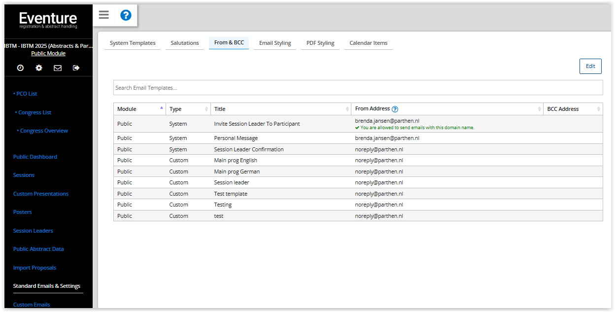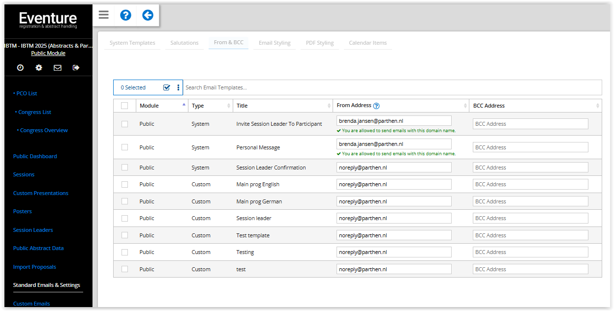 On the 'From & BCC' tab you can check and change all From and BCC email addresses you use for this congress and module.