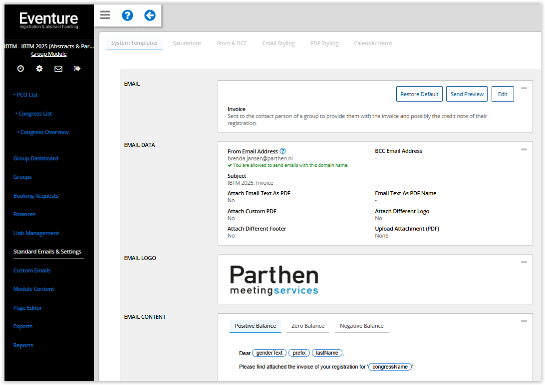 After setting up the invoice, you can send it to a group. You can compose the accompanying email via the blue menu 'Standard emails & settings' and then click the view button at 'Invoice'. For setting up the invoice reminder email, please choose the view button at 'Invoice reminder' in the following screen.