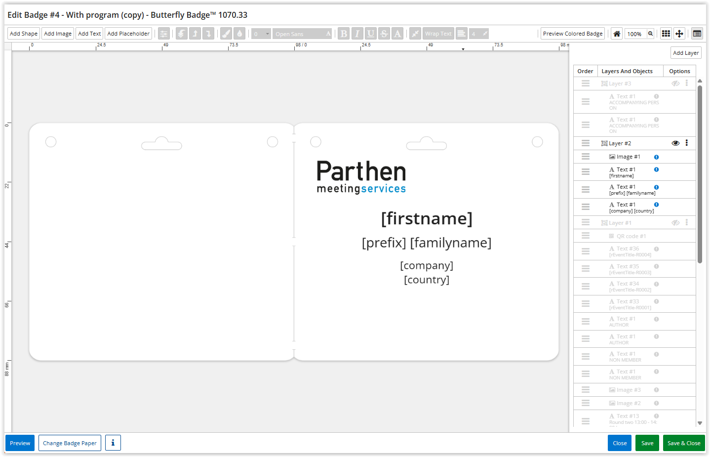 The screenshot above shows all layers. We want to create one badge design for participants with workshops, one for particpants without workshops (they will get the same front and back of the badge) and one for accompanying persons (who will also get the same front and back of the badge).