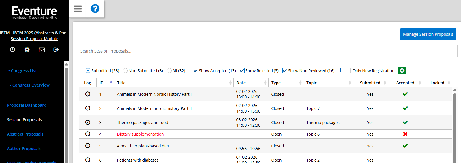 The 'Session Proposals' page lists all currently created proposals within this proposal module, filtered by submitted proposals. By using the 'Manage session proposals' button, you can make changes in bulk to the session proposals.