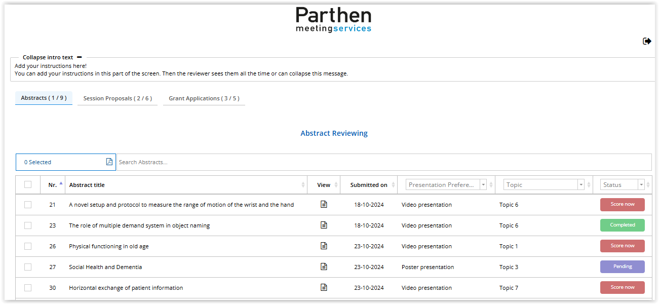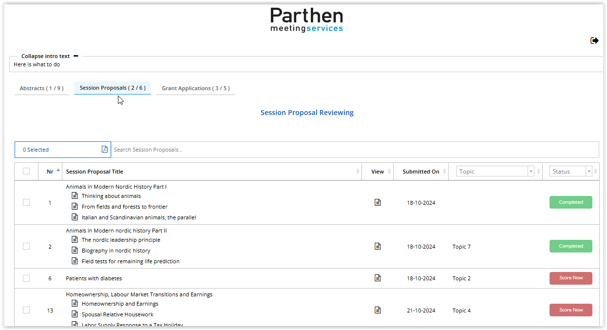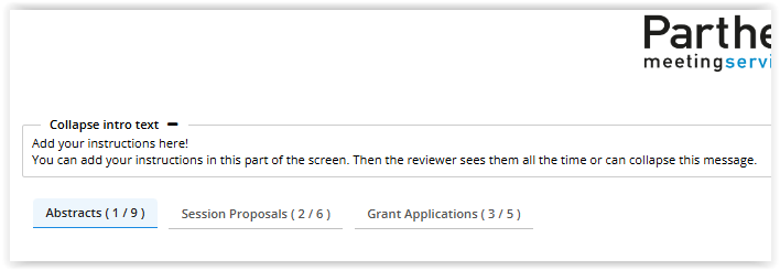 If your reviewers also need to review the session proposals and/or the grant applications, you have to use the setting to display extra tabs on the overview page. The reviewer can now switch between the abstracts, session proposals and grant applications by clicking on the relevant tab.