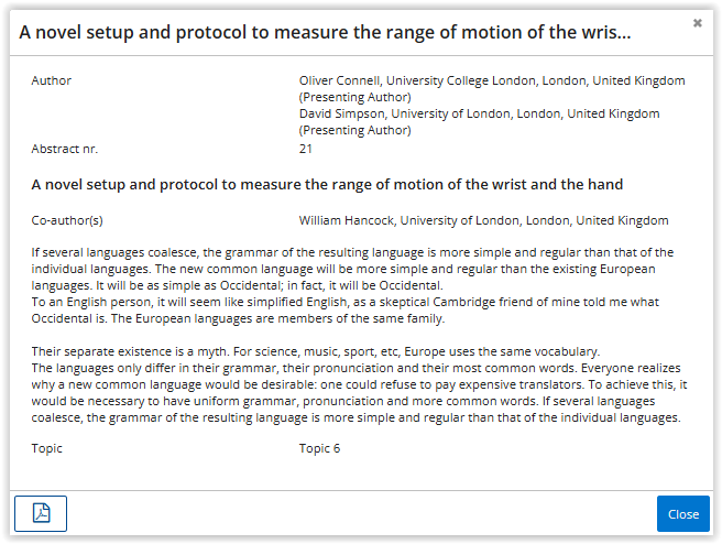 If you use the review module setting 'View closed session proposal abstracts' and the reviewer creates a PDF of this session proposal, all proposed abstracts will also be included in this PDF.