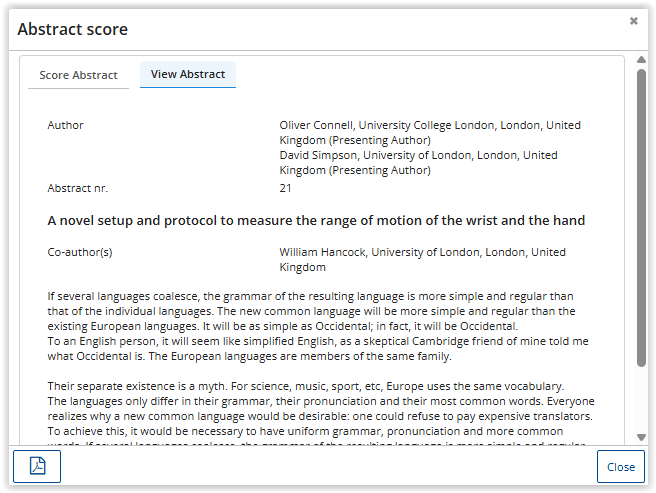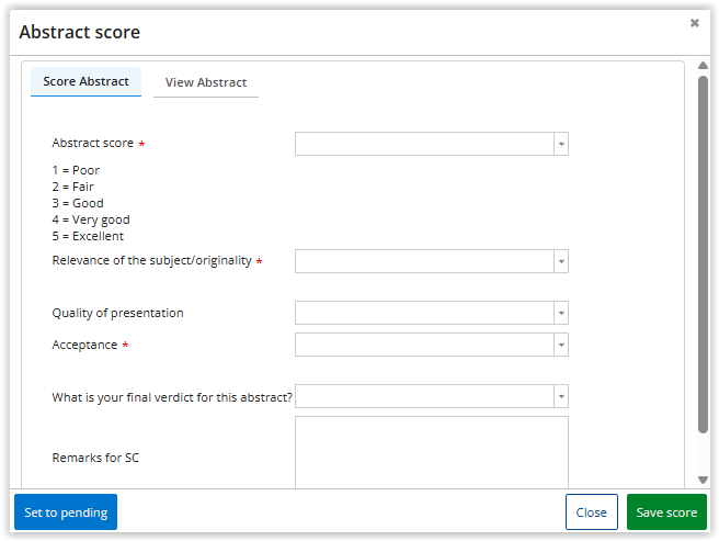 In the scoring screen the reviewer can enter all scores on the 'Score' tab, and the abstract/session proposal/grant application is displayed on the 'View' tab.